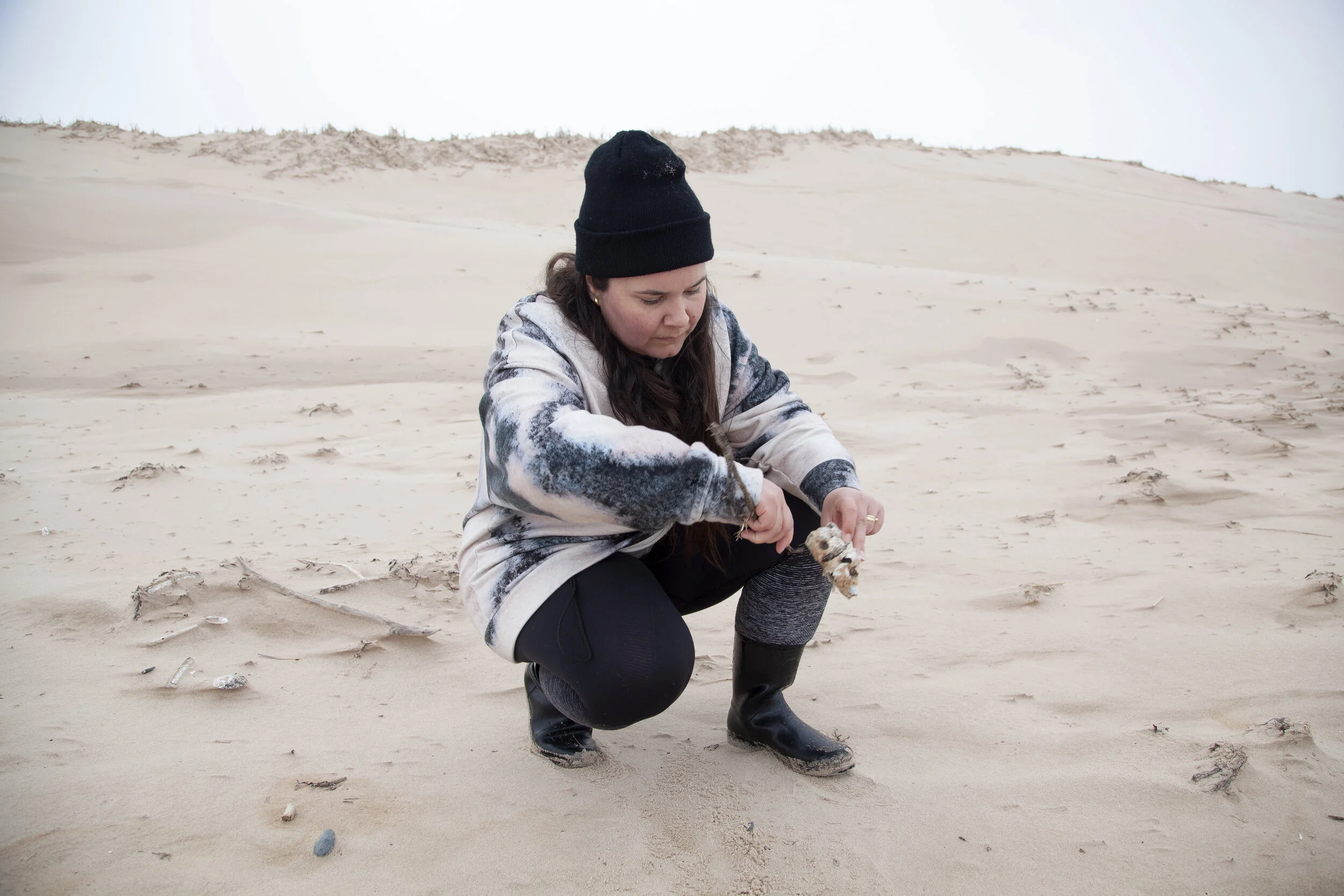 Pendant près de 15 jours en mai dernier, Vicky Sabourin a arpenté les plages des Îles de la Madeleine à la recherche de coquillages, d’ambres gris et de quelques trésors portés par les vagues jusqu’à ces rives. Cette résidence de recherche était organisée par le centre d’artistes AdMare. Elle se concluait par une performance in situ, au pied des dunes de Pointe-aux-Loups, et visait à préparer l’exposition individuelle de Vicky, intitulée Sugar Cakes, qui débuterait en juillet sur l’archipel.